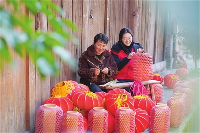 图为1月11日,大同镇党员干部帮助群众制作灯笼。