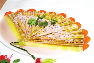 全竹宴又叫“熊猫宴”,共计有十多个大类上百个菜品,竹笋、竹荪、竹荪蛋、竹燕窝……从竹子的根、茎到与竹林伴生的各种菌,只要和竹相关都是主料,经烧、炖、炒、烤、蒸、煲、烩、凉拌等汇成一桌盛大缤纷的全竹宴。