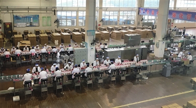 据现场管理人员介绍,生产一瓶茅台酒,要经过洗瓶、灌装、捆箱、入库等十几道工序。而每一瓶茅台酒,还要经过有机食品管理、有机产品标准等六大质量管理体系的管控,才算是合格品。目前,包装车间全体员工开足马力,加班加点生产,以满足市场供应。