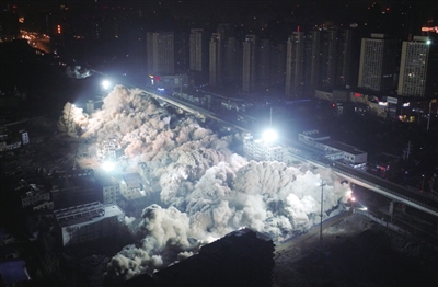 当晚11时50分许,湖北省武汉市汉口滨江国际商务区内的19栋楼房在隆隆爆破声中倒下,全过程共历时约10秒。据了解,本次爆破的19栋楼房层高7至12层,总建筑面积约15万平方米,现场共钻炮口12万余个,使用炸药5吨。为确保安全,本次爆破采取了定向倾倒、纵向逐段倒塌和内爆原地坍塌等3种倾倒方式。