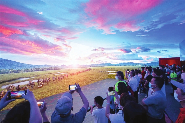 在4D融媒体互动体验项目《长征》中,参观者仿佛置身漫漫征途,和红军战士一同血战湘江、飞夺泸定桥、征服空气稀薄的冰山雪岭、穿越渺无人烟的沼泽草地。