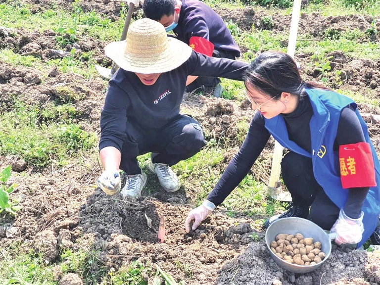 春耕时节,汇川区板桥镇积极引导群众抢抓育苗黄金期,组织党员干部、农技人员投身春耕一线,为实现农业增效、农民增收奠定基础。图为该镇中寺村党总支部党员和群众一起种植魔芋。 (记者 一丁 摄)