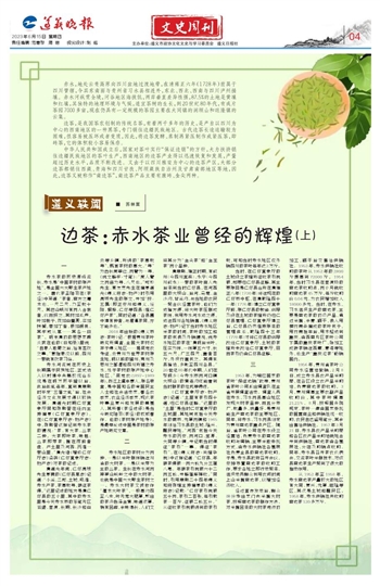 赤水河流域在历史上长期属于民族地区,正式纳入以封建中央集权统治系统是在明万历平播以后。此后战乱连年,直到清康熙时平定“三藩之乱”后,社会经济文化发展才得以较快发展。清道光时期仁怀直隶厅同知陈熙晋在任内主持编纂《仁怀直隶厅志》。在《仁怀直隶厅志·物产志》中,陈熙晋这样记到赤水茶的情况:“茶,有大茶、丛茶二种。大茶即叶茶,味粗;丛茶即芽茶,摘在雨前者佳。产土里及河西、丙滩一带山里。”清光绪《增修仁怀厅志》沿袭《仁怀直隶厅志·物产志》对茶的记述。
