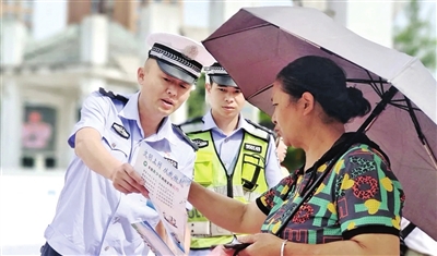 连日来,绥阳县公安局组织民警,多形式开展网络安全宣传活动。图为民警向群众发放宣传资料。