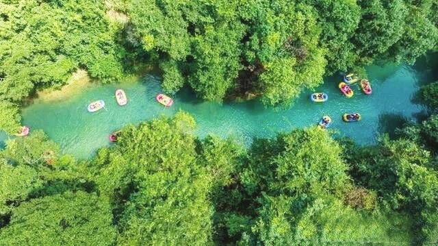 溶洞密布、峡谷绵延、茂林幽深,位于遵义市绥阳县的十二背后旅游风景区是喀斯特地貌的经典呈现,也是开展山地旅游与户外运动的绝佳场所。据景区负责人刘得章介绍,目前景区已经推出了洞穴探秘、飞拉达、攀岩等10多项体育旅游项目,创新开发“洞穴+体育”“洞穴+诗歌”“洞穴+非遗”等文旅新业态,成功获评国家级体育旅游示范基地。而地处雷公山东南麓八妹河上游的黔东南州榕江县乐里镇,山林间散落着72个侗族村寨,一直在传承和发展斗牛的民间传统活动。这里有亚洲最大斗牛场,吸引了西班牙驻华大使的目光。