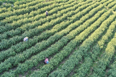 3月26日,茶农在贵州省遵义市正安县瑞溪镇桂花园茶园采茶(无人机照片)。