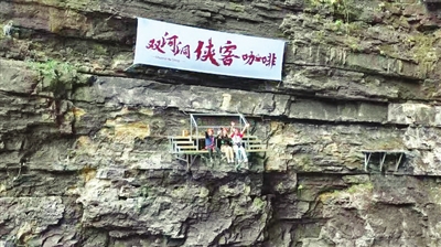 据介绍,游客首先要徒步穿越5公里的地下河谷,接着穿戴好专业装备,在教练指导下踏上60米的高空钢索,横渡40米的天坑峡谷,还要通过120米绝壁飞拉达攀岩后才能抵达悬空木台,品尝到这杯独特的咖啡。