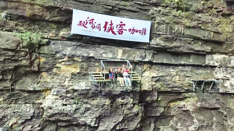 近日,绥阳县十二背后旅游区推出的“双河洞·悬崖之上侠客咖啡”正式上线。在这里,游客可坐看原始峰丛峡谷,俯瞰天际云海霞光。