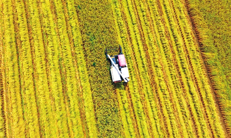 图为近日,大型收割机在狮溪镇高标准农田作业。