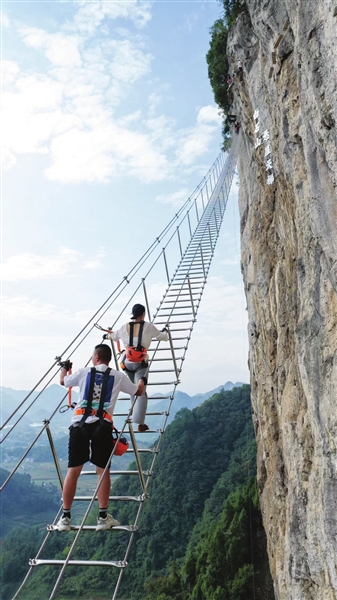 “我在抖音上看到视频,就特地约上朋友赶来体验。”刚从悬崖天梯下来的游客王会芬兴奋地说,“攀完岩,再喝上一杯悬崖咖啡,眼前是壮丽风光,心情特别安逸!”